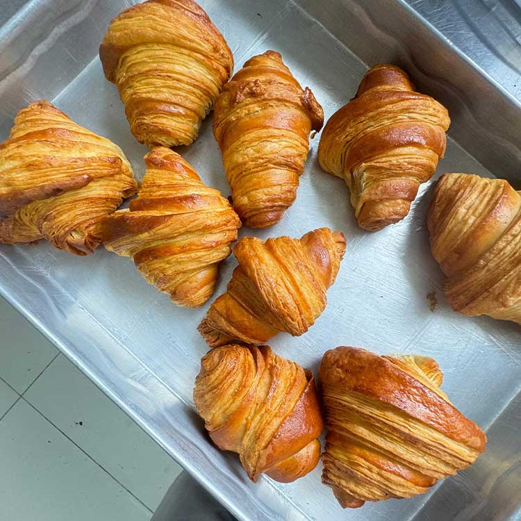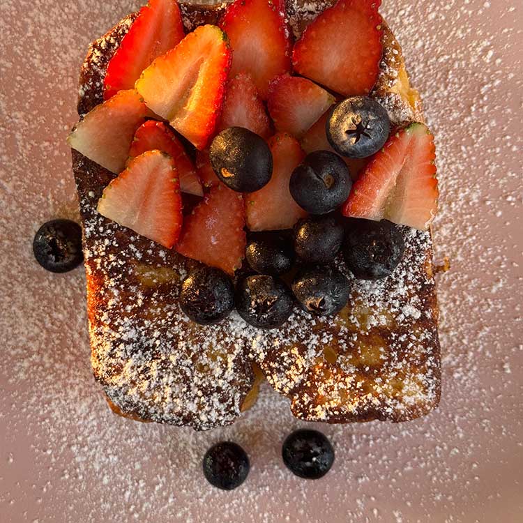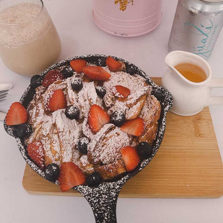 Croissant horneado diariamente en mezcla de tostadas francesas con fresas, arándanos, almendras fileteadas y espolvoreada con azúcar glass. Servidas en sartén de hierro.
