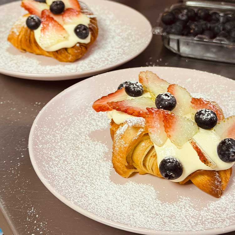 Croissant francés con queso Philadelphia, fresas, arándanos y espolvoreado con azúcar glass.