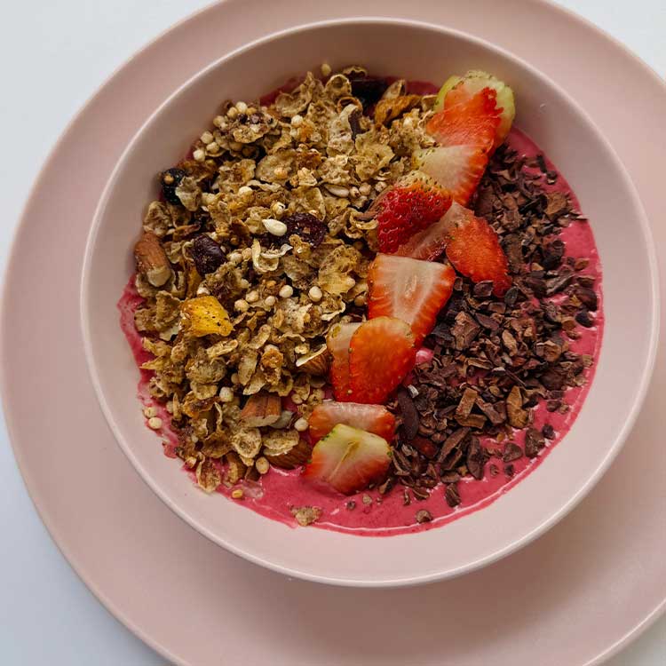 Mezcla de moras y fresas frescas con yogurt griego y mantequilla de maní, acompañado de granola, fresas y arándanos.