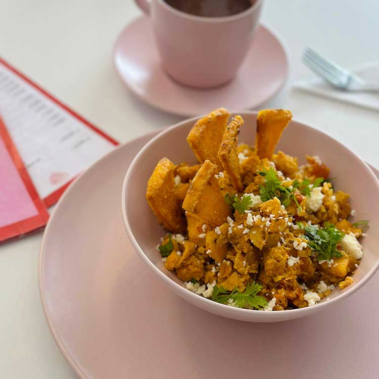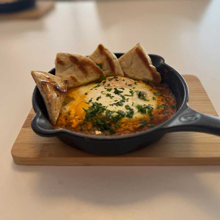 Huevos en sartén de hierro, bañados en una salsa de tomate, pimentón y especias, acompañados de una deliciosa combinación de yogurt griego y pan árabe. Contienen pimienta.