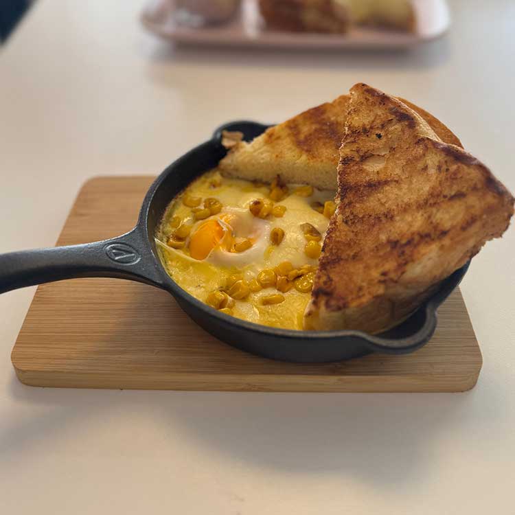 Huevos sobre una base cremosa de maíz, con queso mozzarella, cheddar y maíz parrillado. Se sirven acompañados de pan brioche tostado.