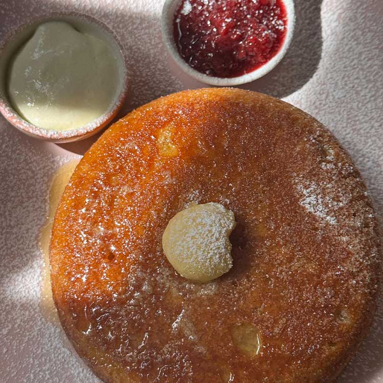 Los esponjosos pancakes virales, con una salsa de miel y mantequilla montada, acompañada con frutos rojos casao y crema montada.