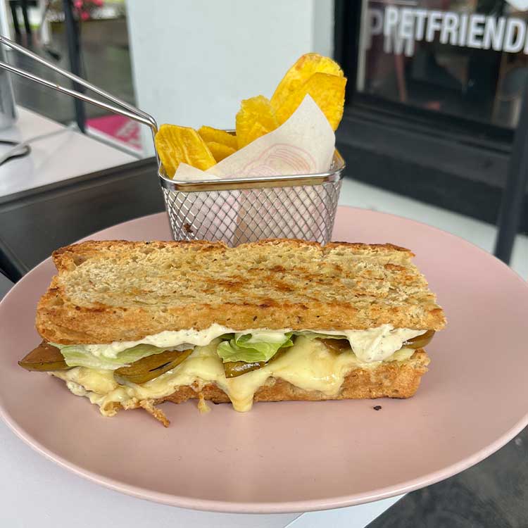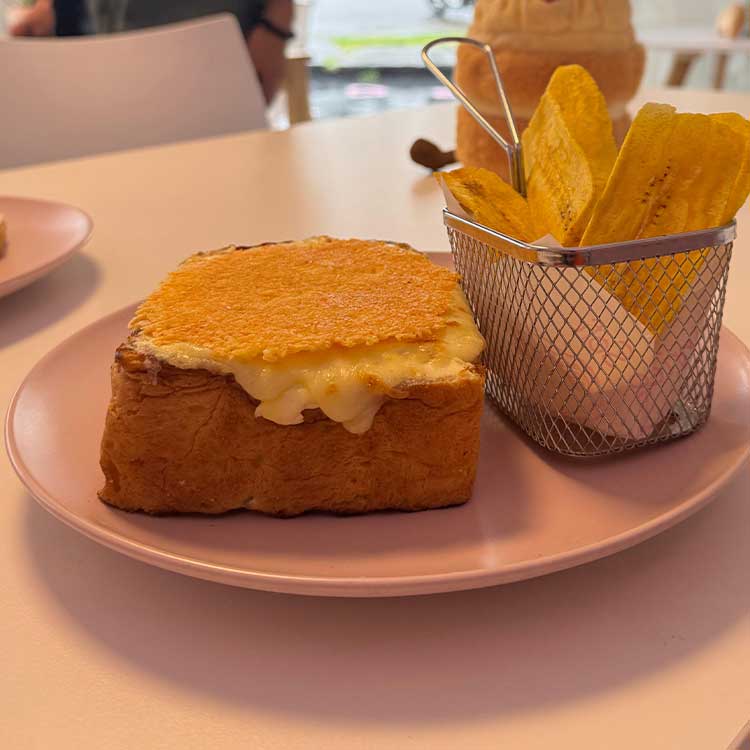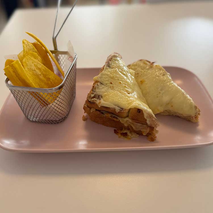 Pan brioche cubierto con una suave salsa bechamel, queso mozzarella y queso suizo gratinado, acompañado de crujientes chips de plátano verde hechos en casa.