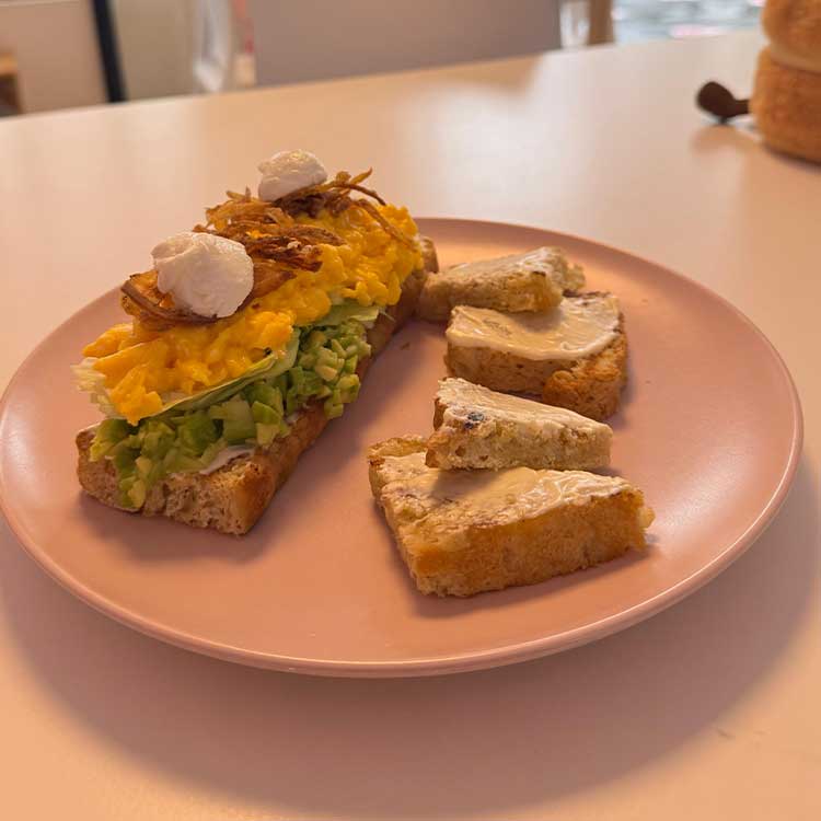 Pan focaccia con miel cremosa de la casa, huevos scrambled, germinados, aguacate, cebollas rebozadas y queso mozarella de búfala.